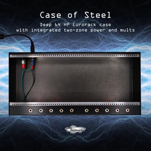 Case of Steel (aka Skiffy McSkiffface) is a steel case designed to house and power your modules. Designed from the ground up to feel (and look) solid, the case stays put while you patch, and integrated power and included power brick make it simple and convenient to power your favorite modules. Black powder-coat paint is scratch-resistant. Integrated passive mults save space and make patching even easier, and the deep design can hold all but the tallest modules. Case of Steel also features fixed rails -- no sliding nuts around trying to assemble your case!